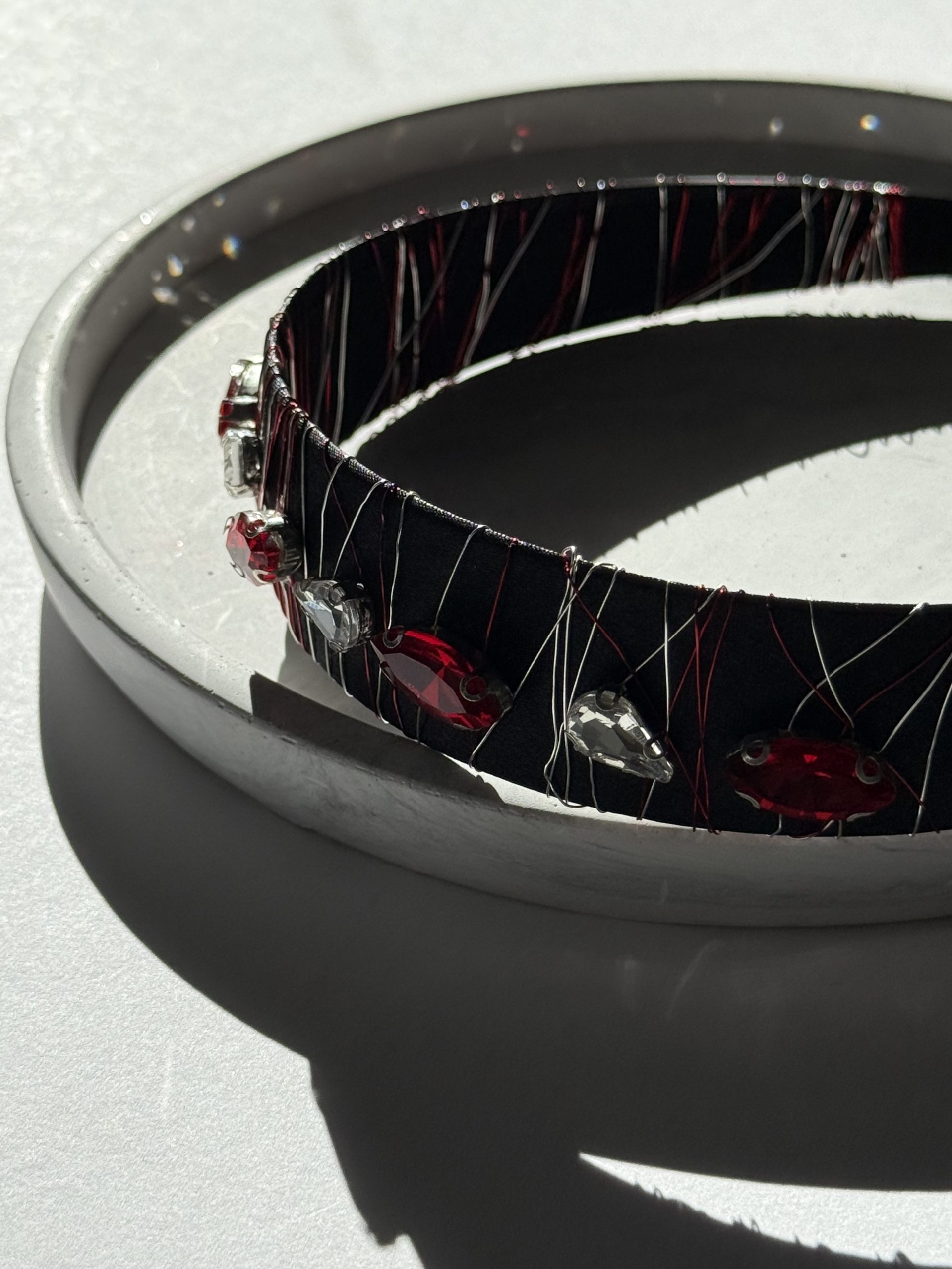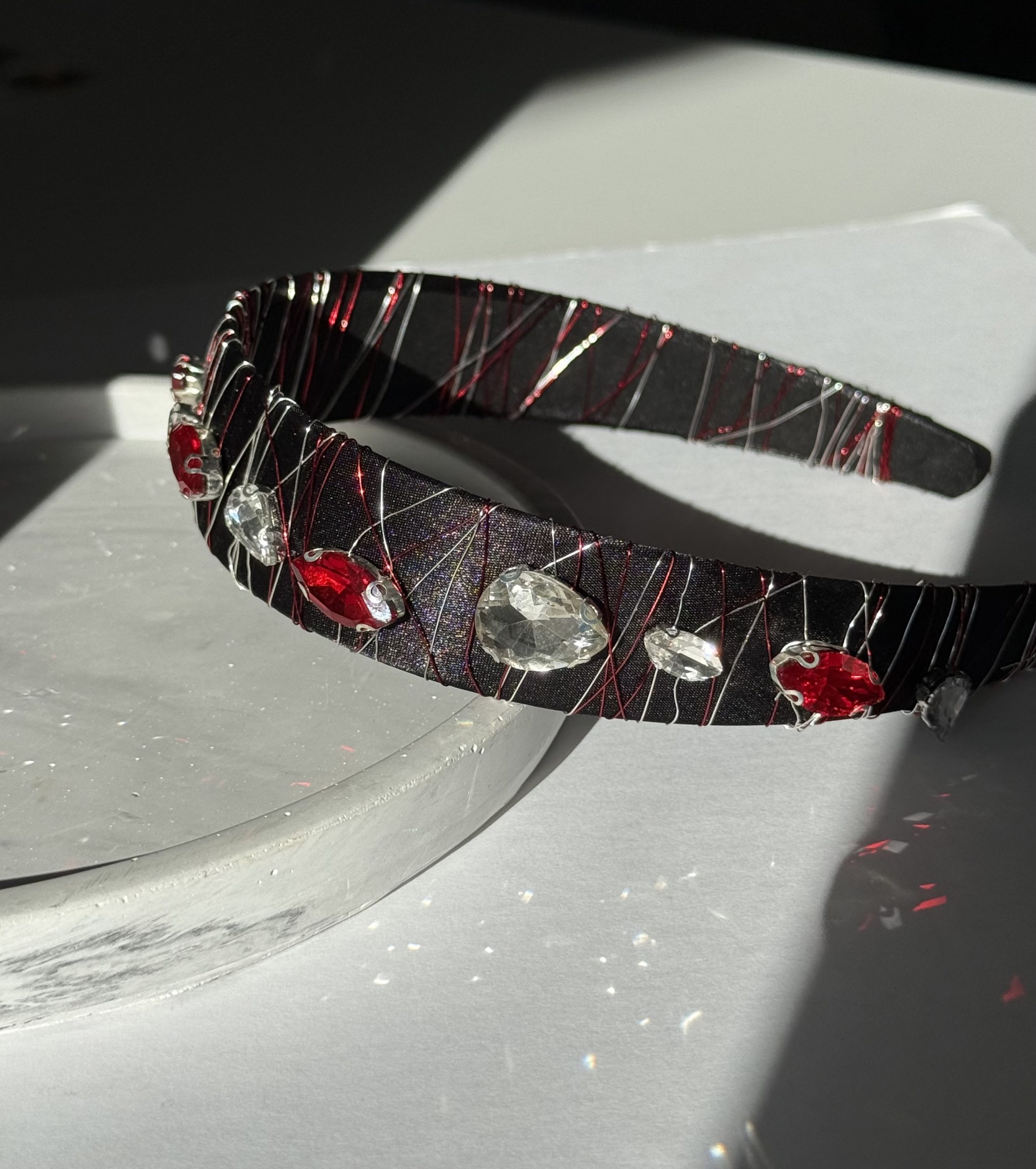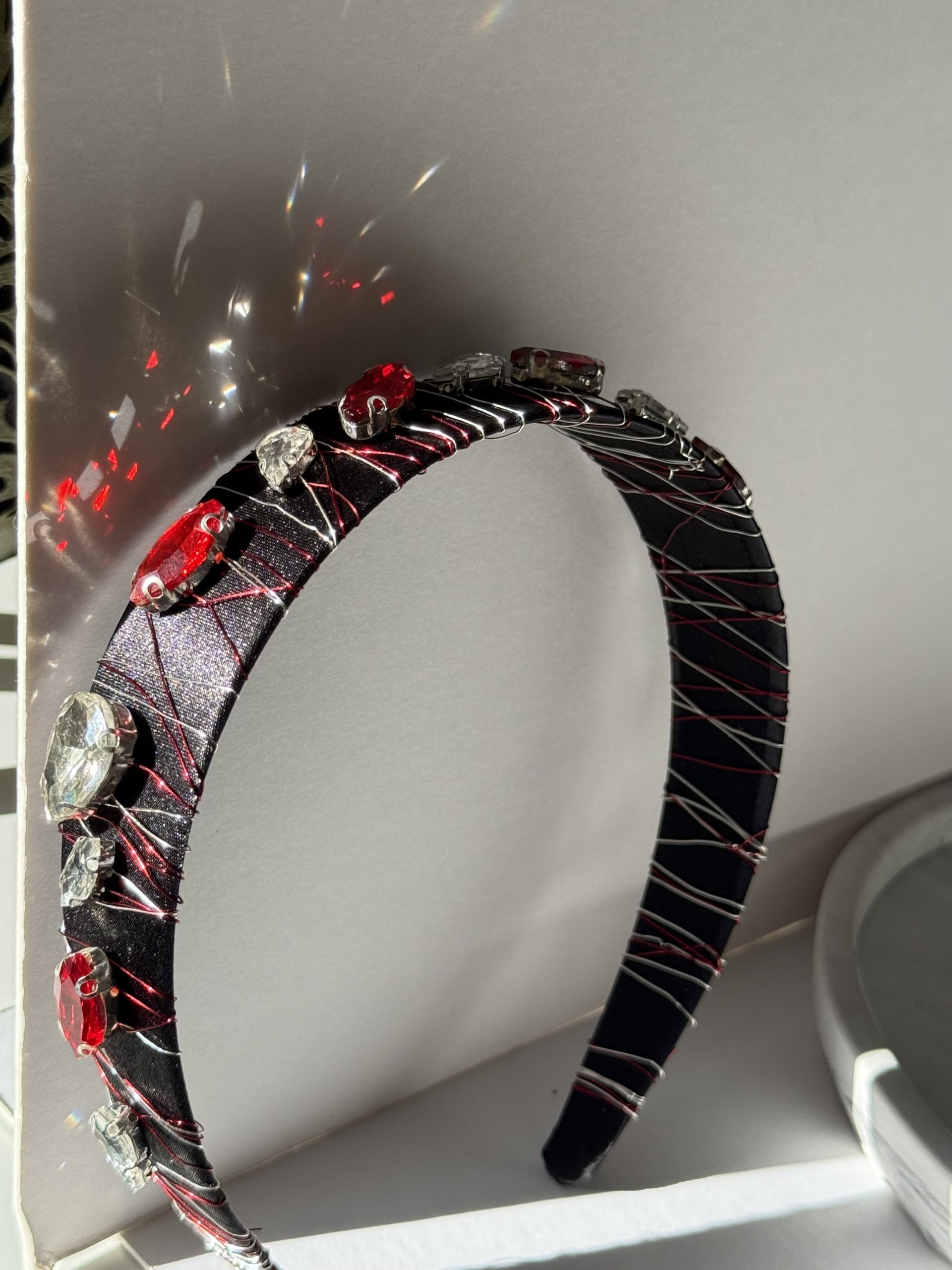 Kırmızı ve şeffaf kristal cam taşlarla süslenmiş. Tel sarma detaylı el yapımı taç.